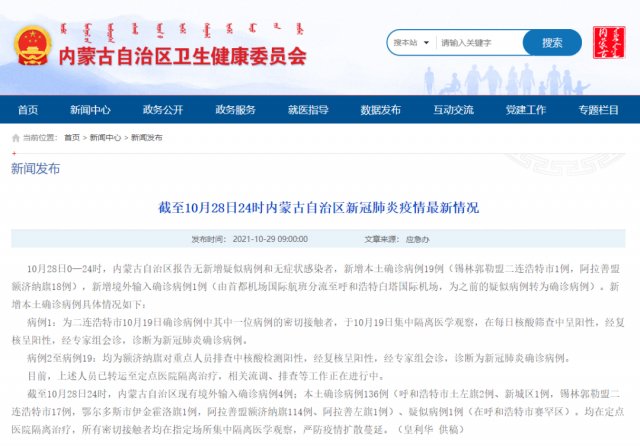 截至28日24时,内蒙古自治区本土确诊病例136例(呼和浩特市土左旗2例、新城区1例,锡林郭勒盟二连浩特市17例,鄂尔多斯市伊金霍洛旗1例,阿拉善盟额济纳旗114例、阿拉善左旗1例)、疑似病例1例(在呼和浩特市赛罕区)。